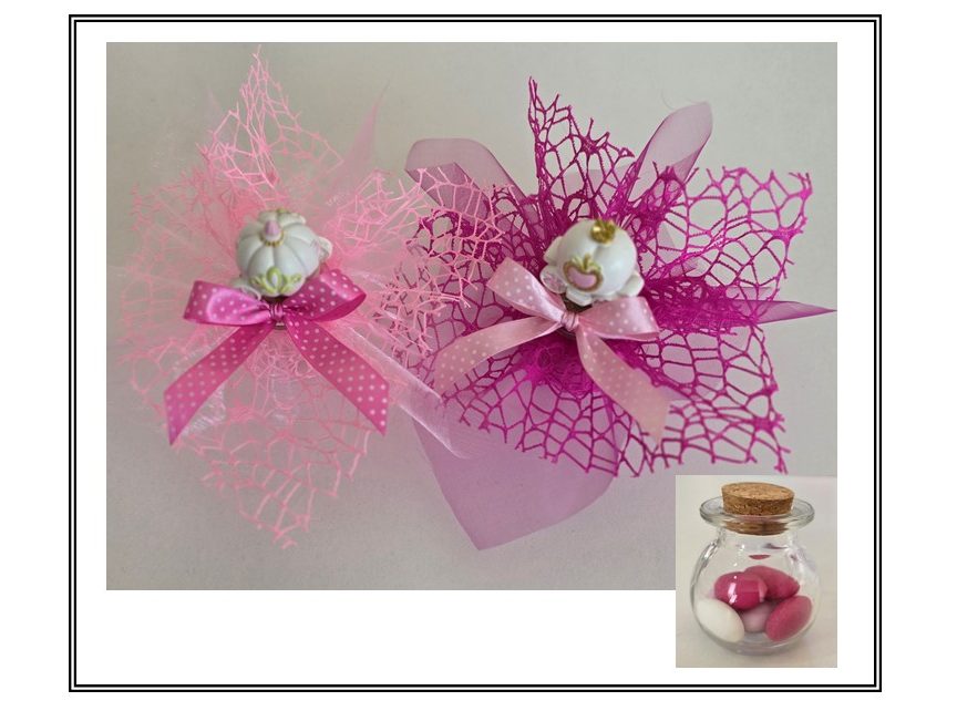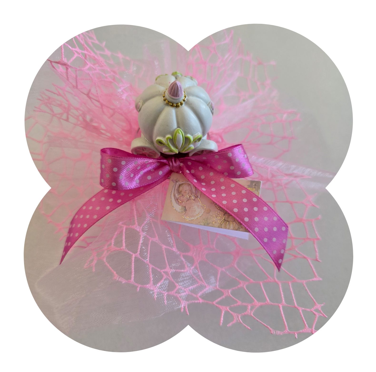 „Mini Carrozza Bimba 2 assortite“, su Boccetta con Sacchettino „Rete con velo“ rosa e fuxia. Fiocco rosa e fuxia pois. Bigliettino esterno