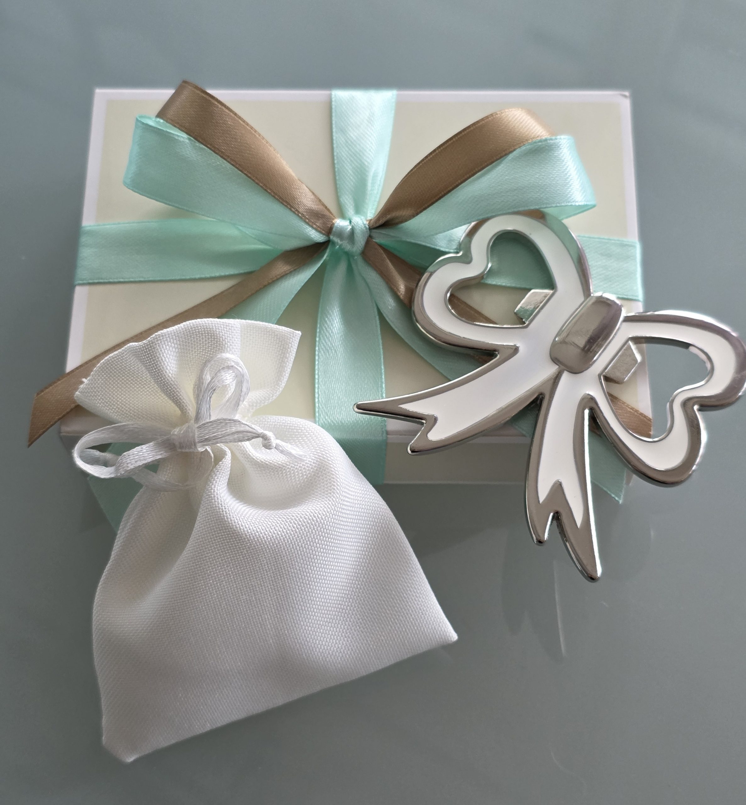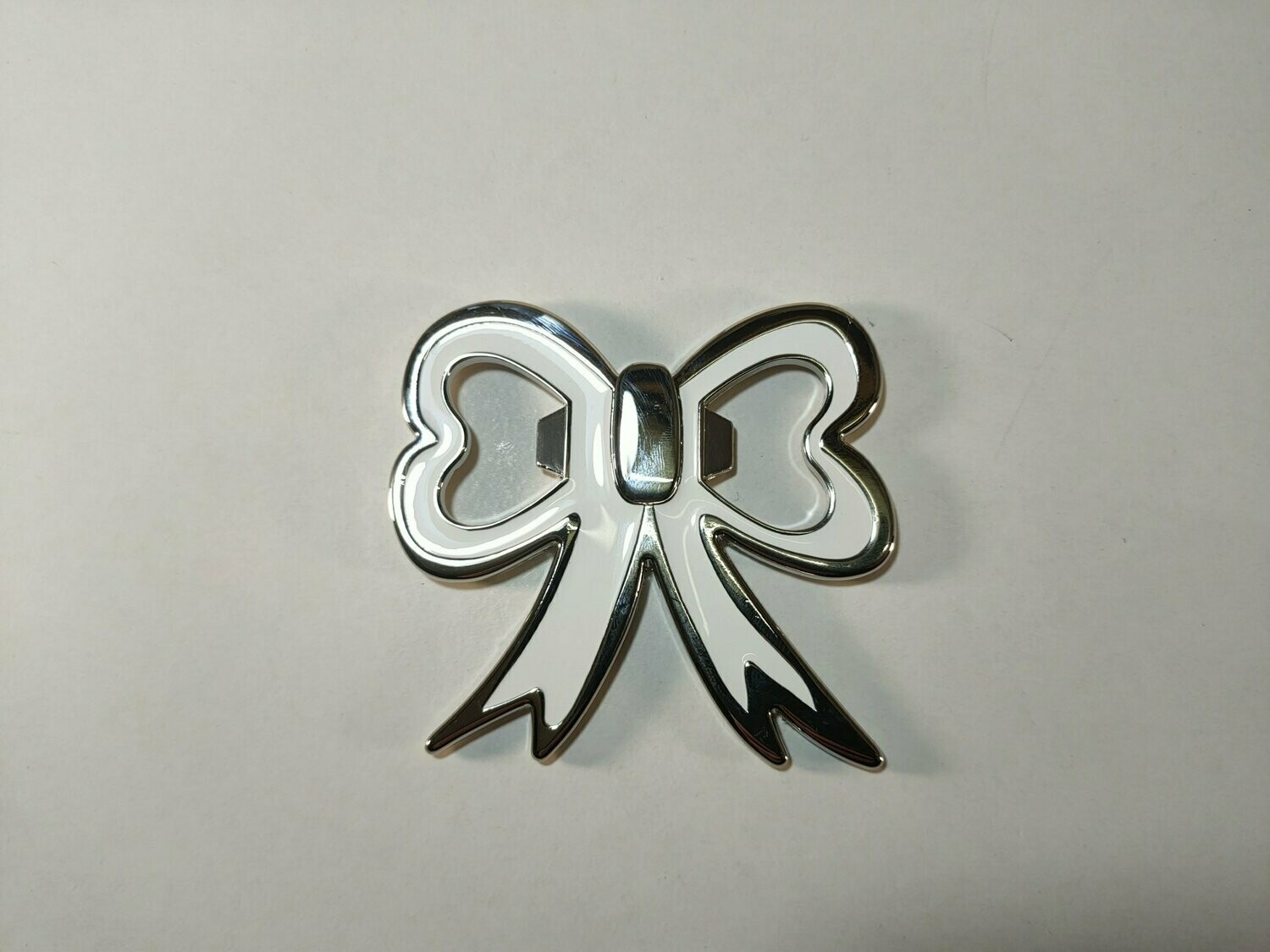Apribottiglia in metallo con calamita a forma di „Fiocco“ smaltato in bianco. Misure 7,5 x 7 cm, con sacchettino incluso. Idea per comunione, cresima, anniversario o altre occasioni. Contattatemi per i bigliettini corrispondenti.