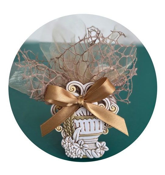 Bomboniera economica „Icona Albero Vita Comunione“ in resina con sacchettino rete-velo, nastro decorativo, confetti e bigliettino. Dimensioni icona ca. h 8,5 x 6,5 cm. Incluso cesto colore avorio per la vostra presentazione durante le festività.